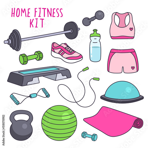 Home Fitness Kit Vector Illustrations Workout Equipment Set